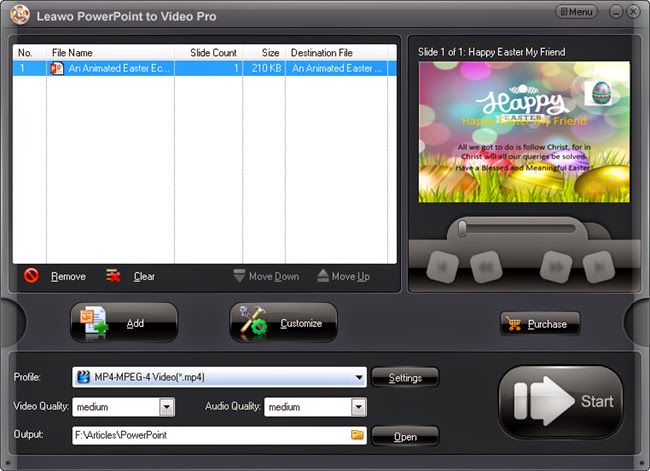 Step 1.Run Leawo PowerPoint to Video Converter Pro on your computer, and you'll see the main interface of the software. Click "Add" to import the Easter card into the software. The preview screen will display the PowerPoint presentations.