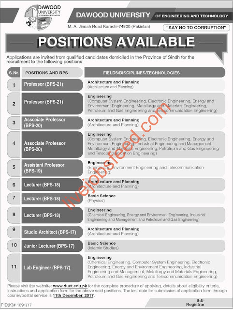 Dawood University of Engineering & Technology Positions Available Professors, Associate Professors, Lecturers, Studio Architect, Lab Engineers & Others Apply Online Last Date 11-12-2017