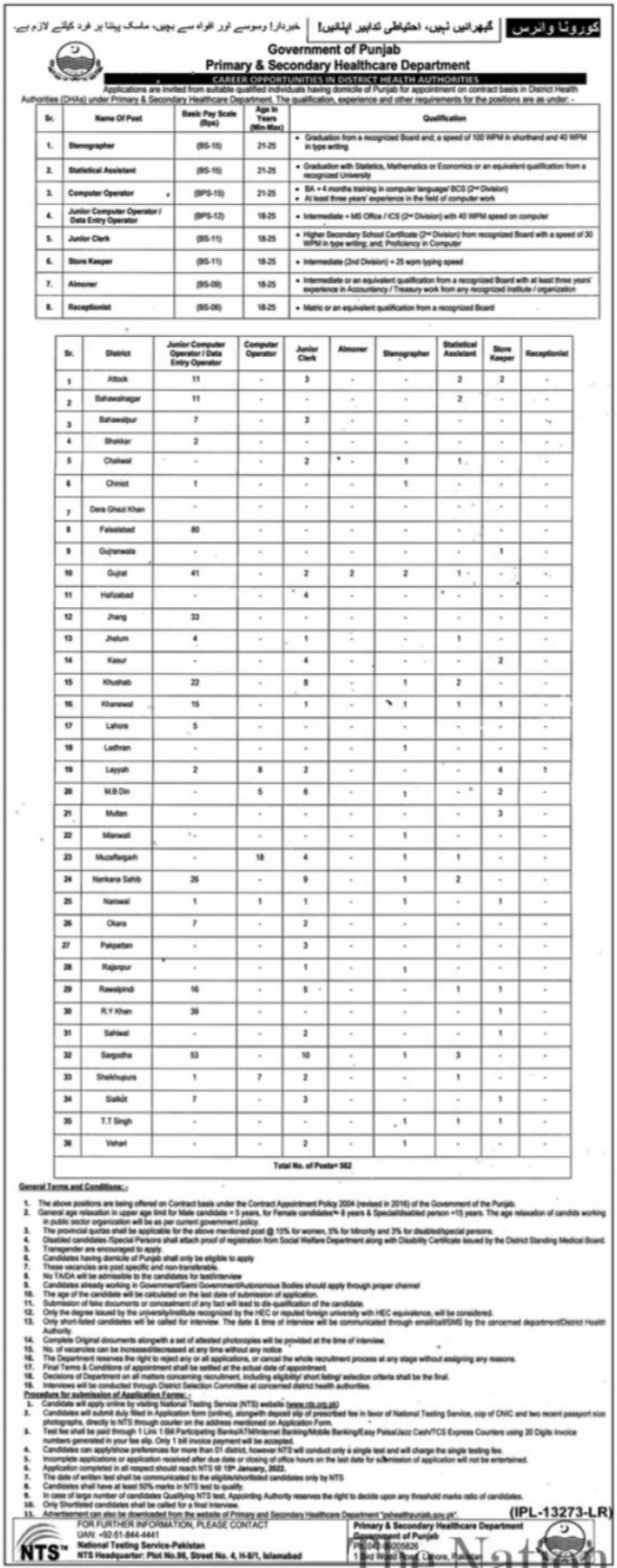 According to the Nation Jobs Newspaper advertisement Government of Punjab is looking for candidates to fill the posts of Stenographer, Statistical Assistant, Computer Operator, Junior Computer Operator, Data Entry Operator, Junior Clerk, Store Keeper, and Receptionist within the Primary and Secondary Healthcare Department in Lahore. The Last Date to apply is 07-01-2022.