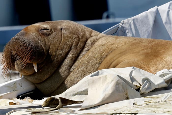 Freya the walrus — seen resting on a boat in Frognerkilen, Oslo Fjord, Norway in July — was recently put down by government authorities.